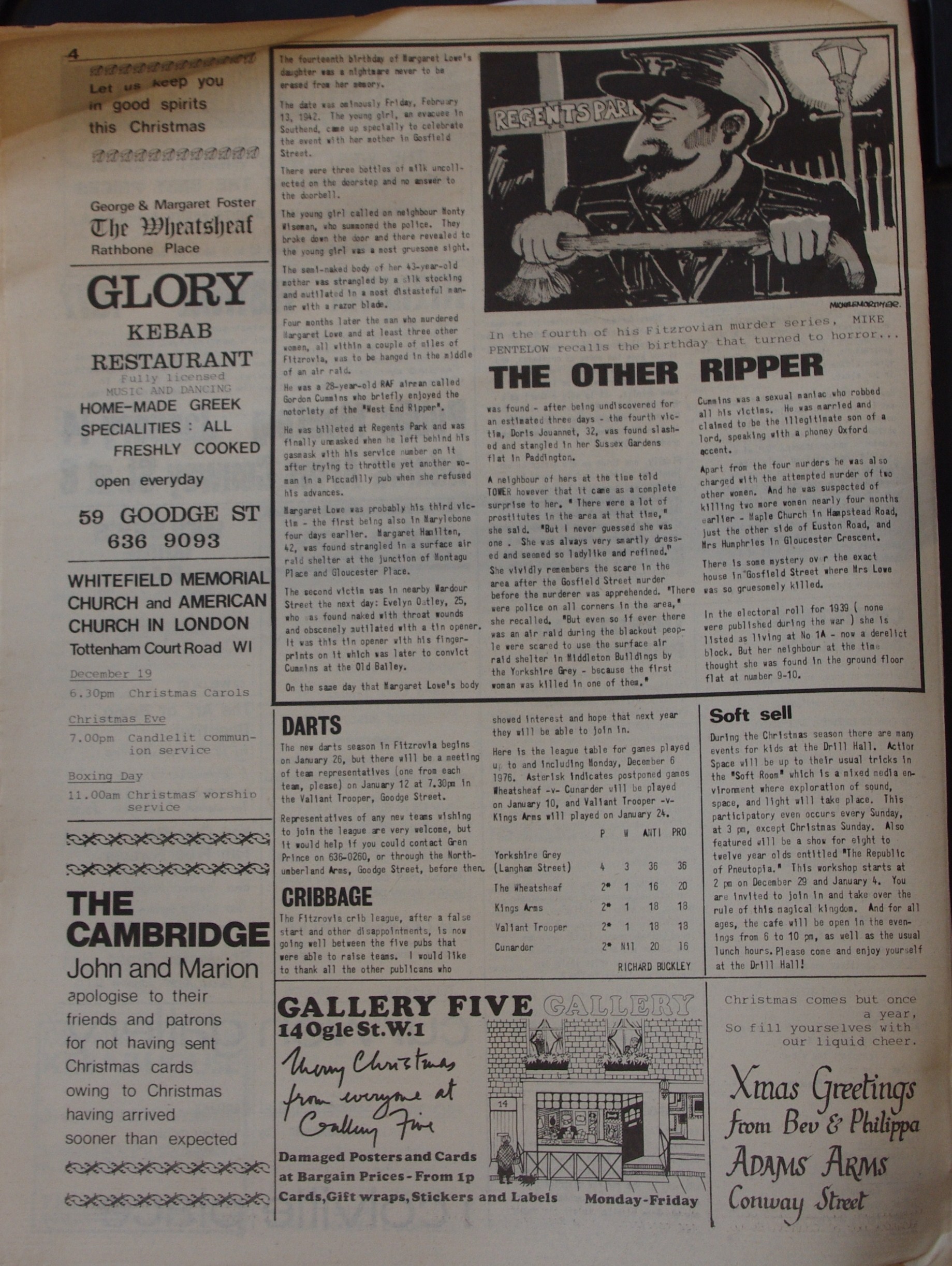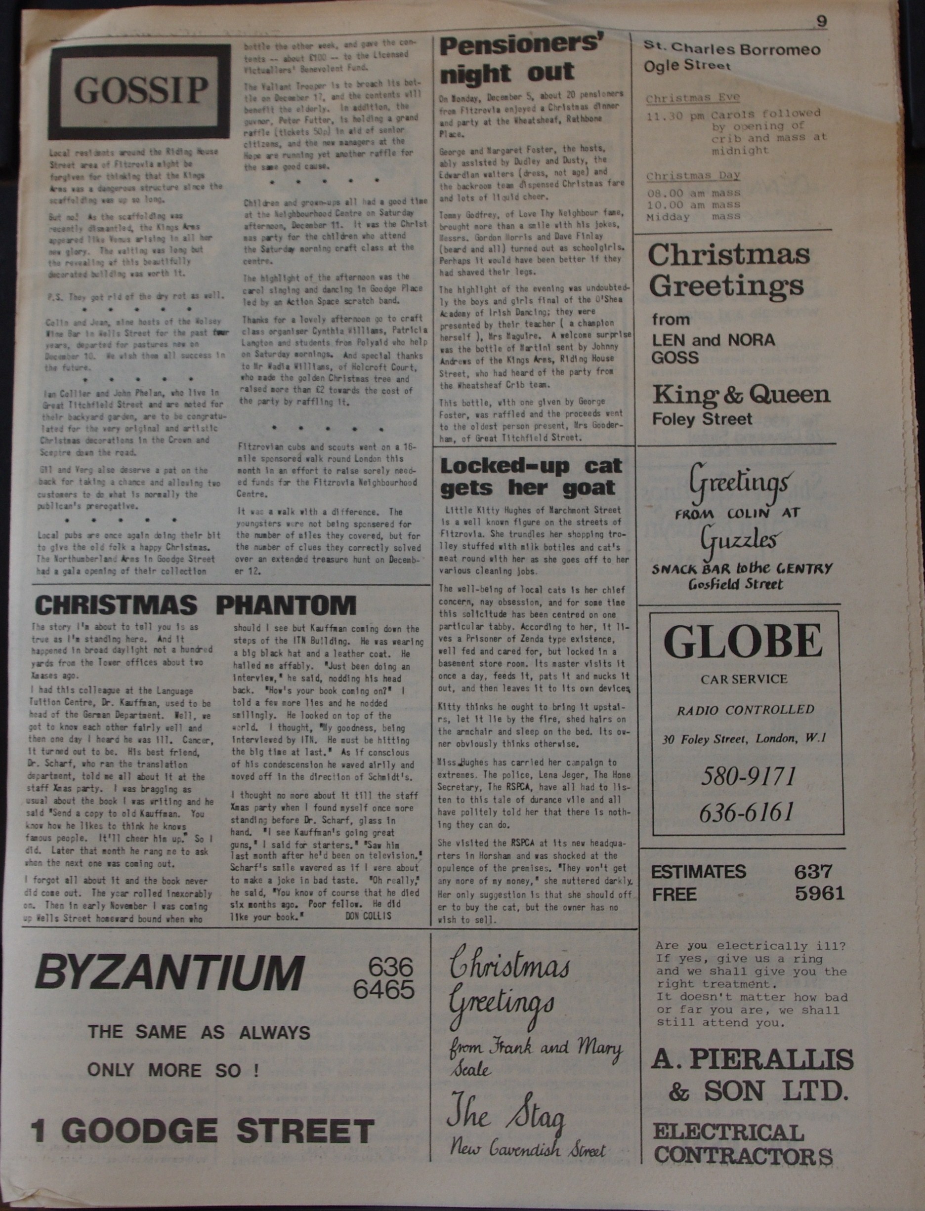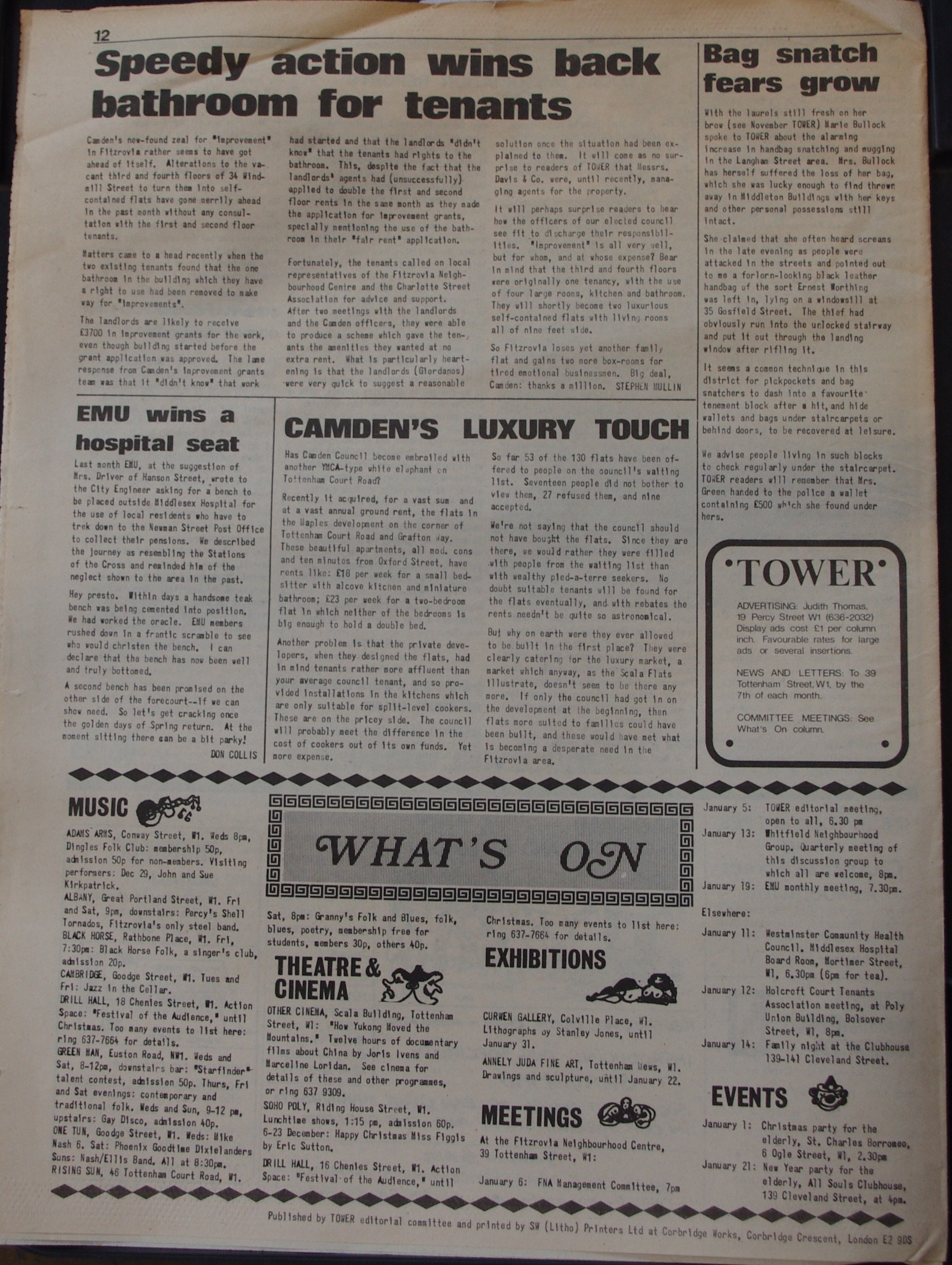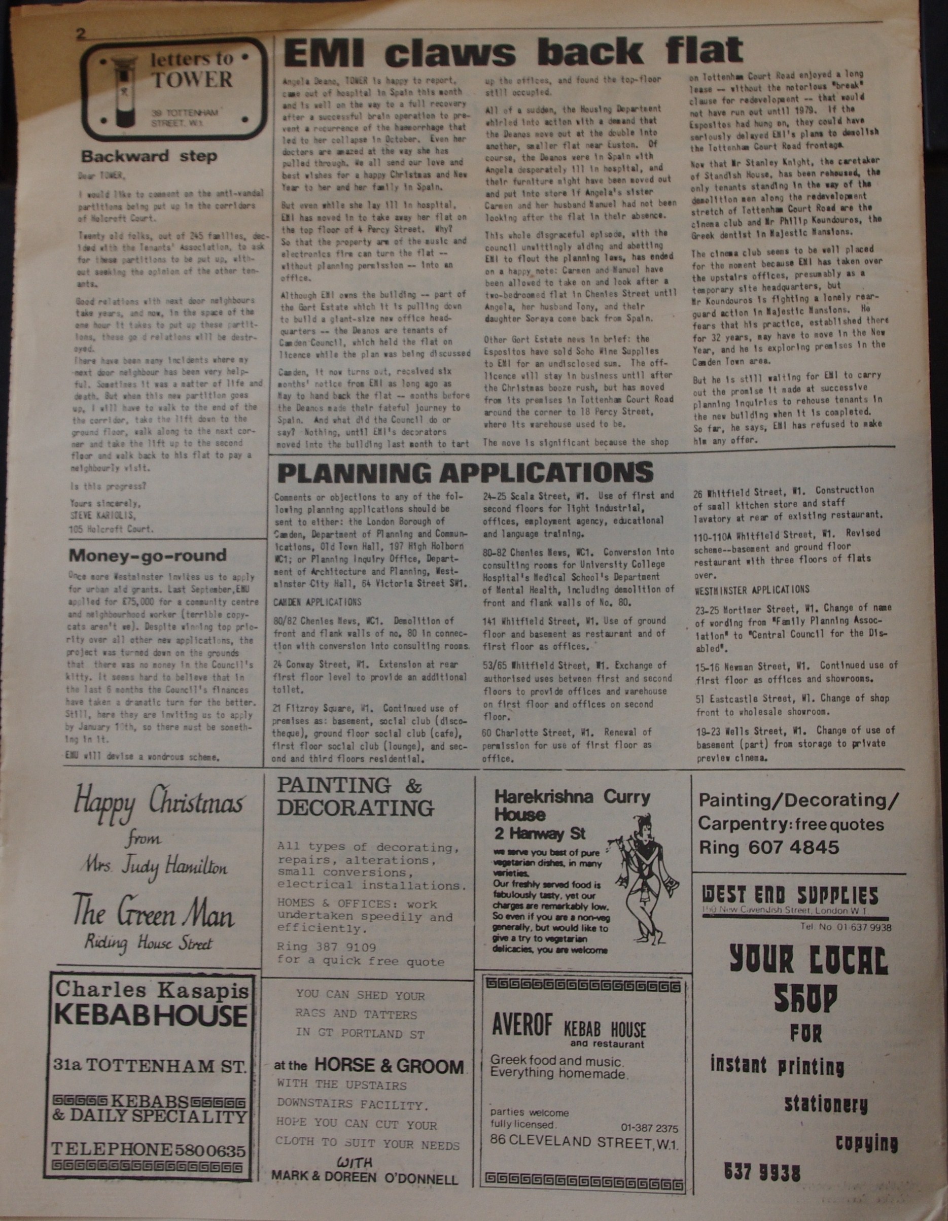 Front Page. A Christmas tale of council neglect; Tottenham Street; Camden housing department. Squatters booted out; Cleveland Street; Buckingham House; GLC; Paddington Churches Housing Association (PCHA); Evening Standard; Simon Jenkins. Over £70 raised; Tower Christmas jumble sale.
