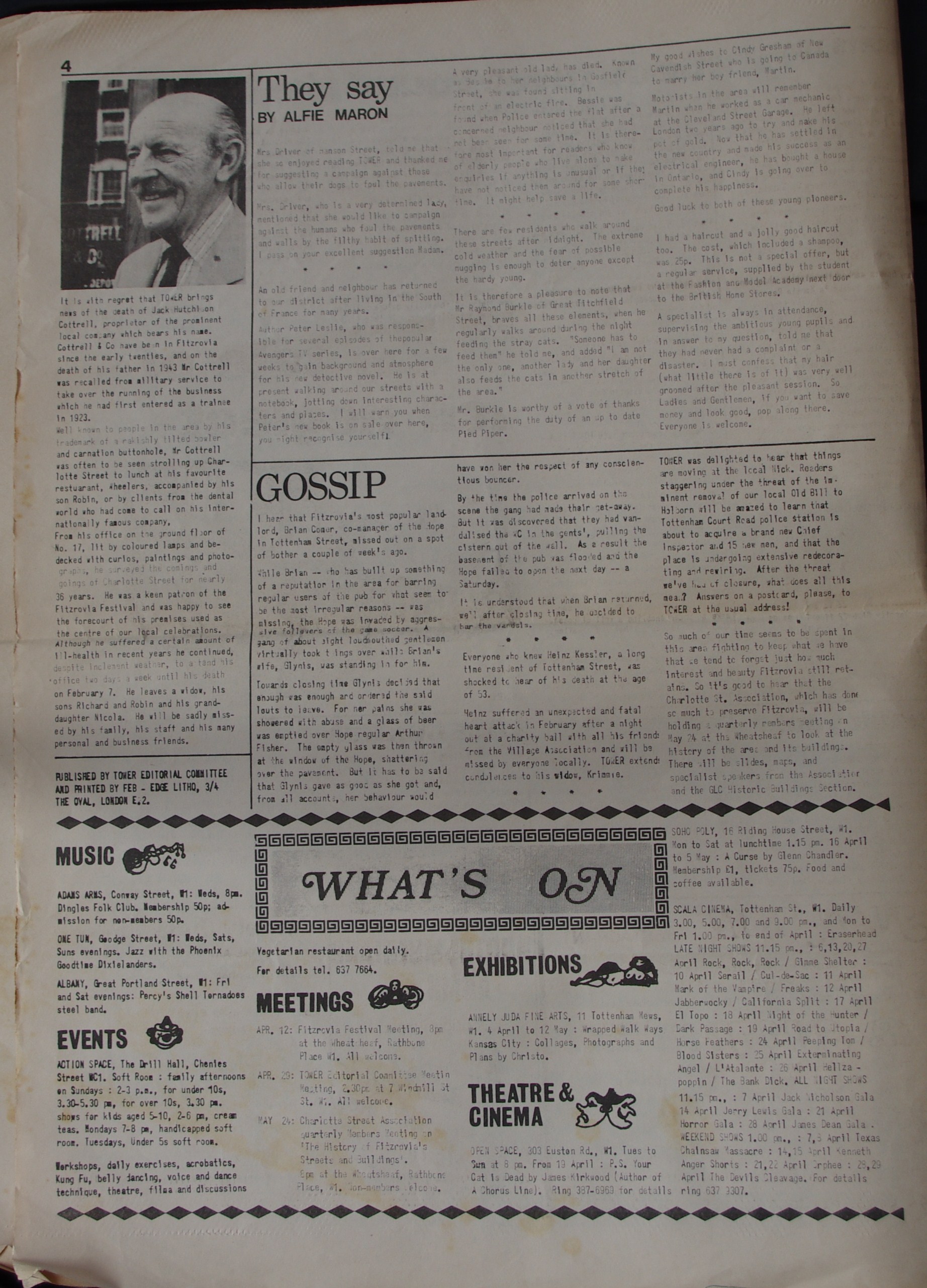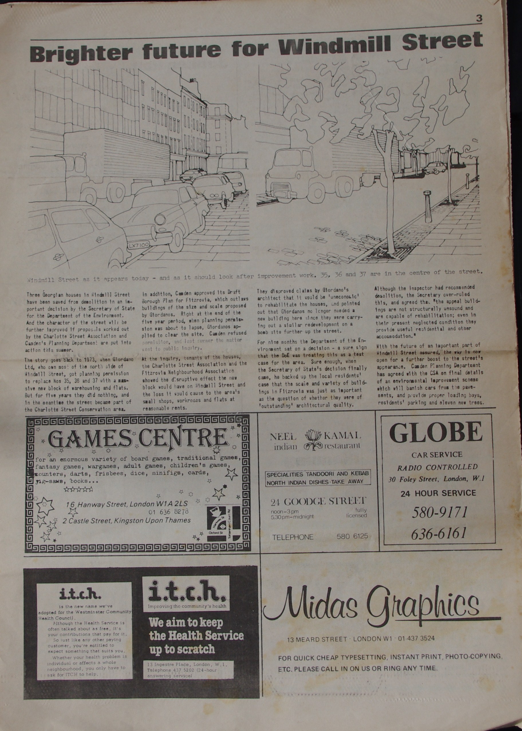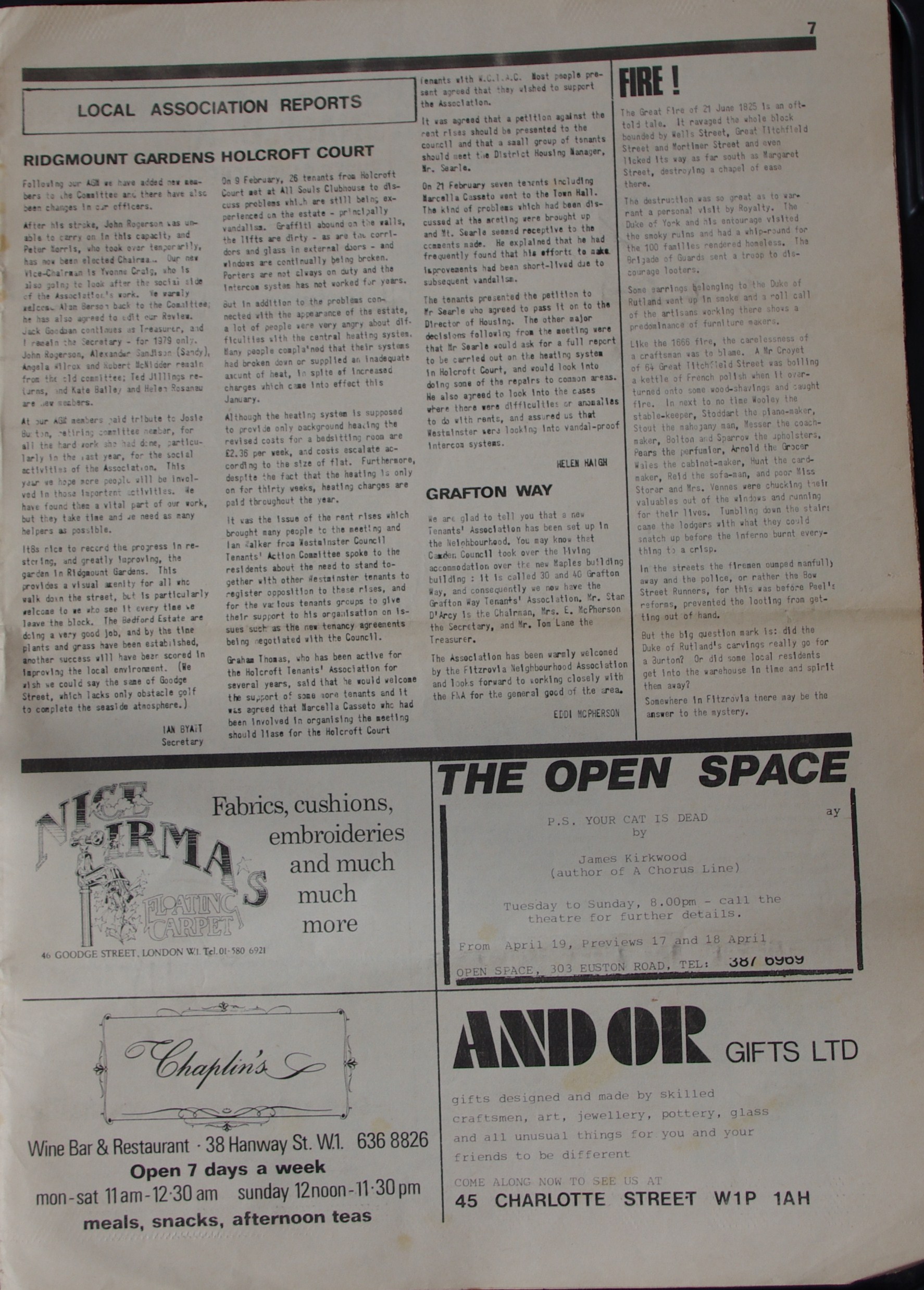 Front Page. Nassau St tenants fight Sheik up; plans to turn housing into luxury hotels for families of private patients of the Middlesex Hospital, by Mike Pentelow. Farewell…; Local activists Patrick Ensor and Judith Thomas are leaving Fitzrovia to live in Queen’s Crescent. Hands off our nursery! The Fitzrovia Nursury Group in Percy Buildings has had to move to the Mary Wad Centre in Kings Cross.