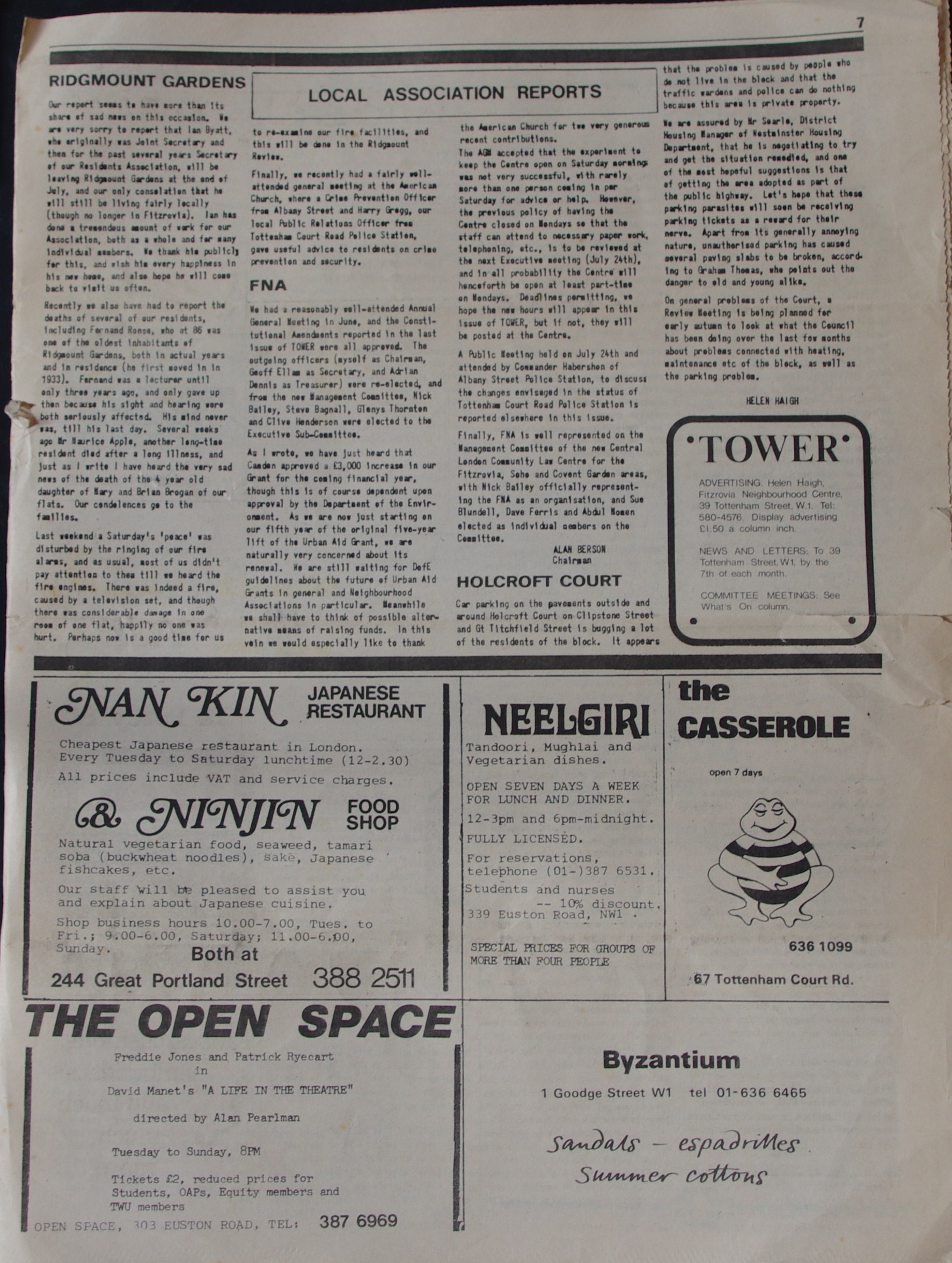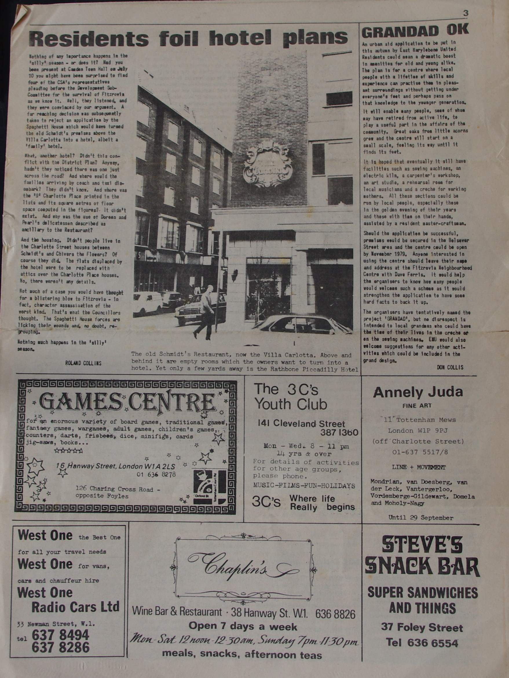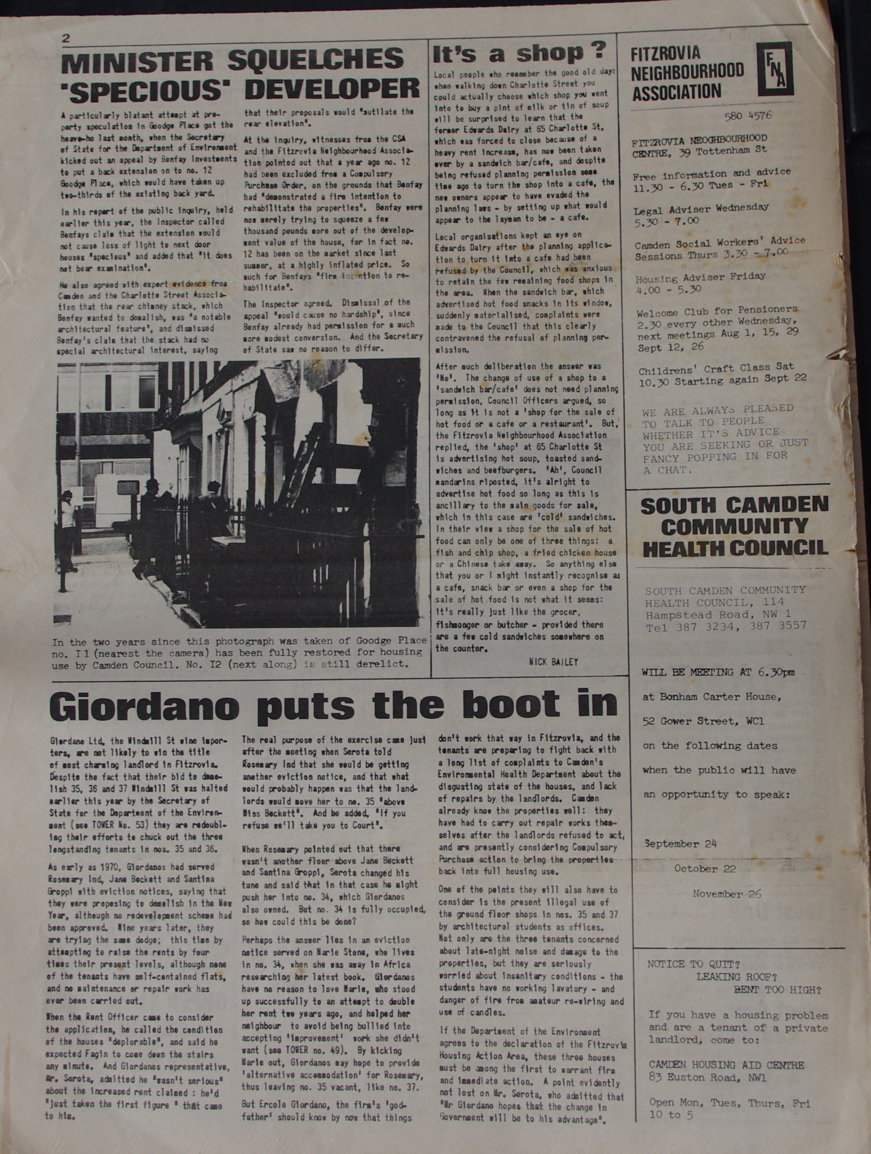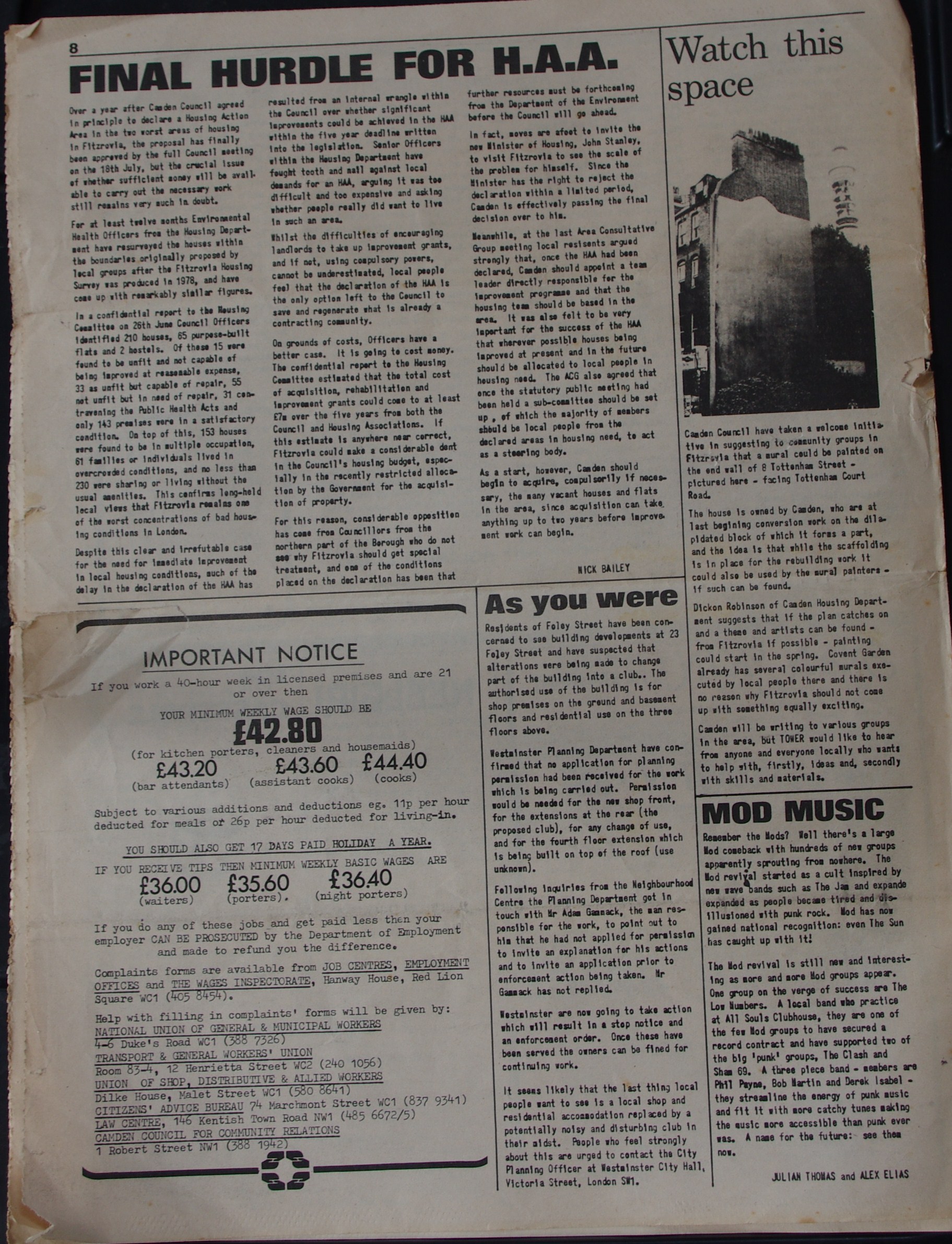 Front Page. Health service cuts will hit Fitzrovia; Community Health Council, NHS, Middlesex Hospital, Mortimer Street, by Judith Dainton. Cross your digits; plans for Tottenham Court Road police station laid out. EMI again; After 12 years as a caretaker on the Gort Estate Stan Knight is being thrown on the streets by his landlord; Stephen Street, Percy Street.