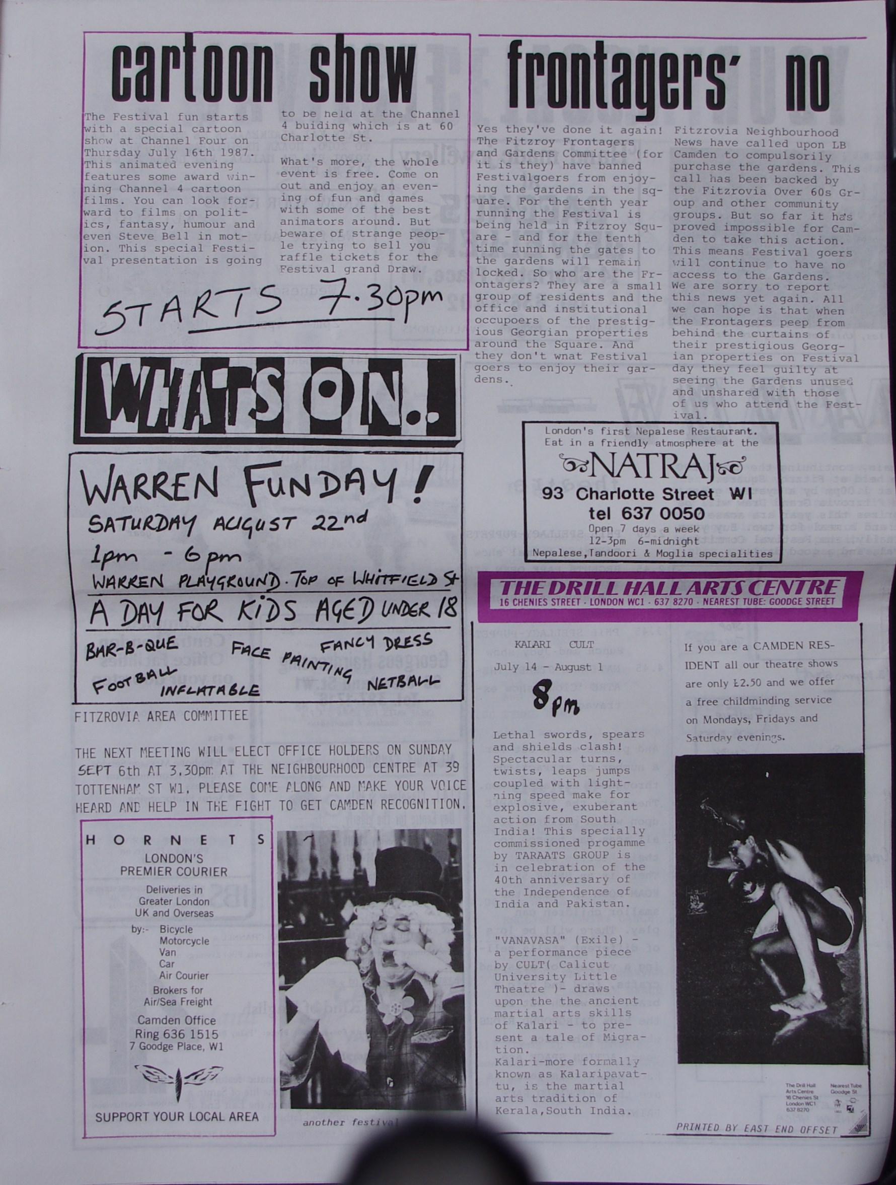 July 10, 1987March 10, 2013 Reporter Fitzrovia Neighbourhood News no 36 July 1987 Front Page Fitzrovia Neighbourhood News no 36 July 1987 Front Page. Fitzrovia Festival in Fitzroy Square. Pages 2 – 3 Fitzrovia Neighbourhood News no 36 July 1987 Pages 2 – 3 Page 4 Fitzrovia Neighbourhood News no 36 July 1987 Page 4. Related