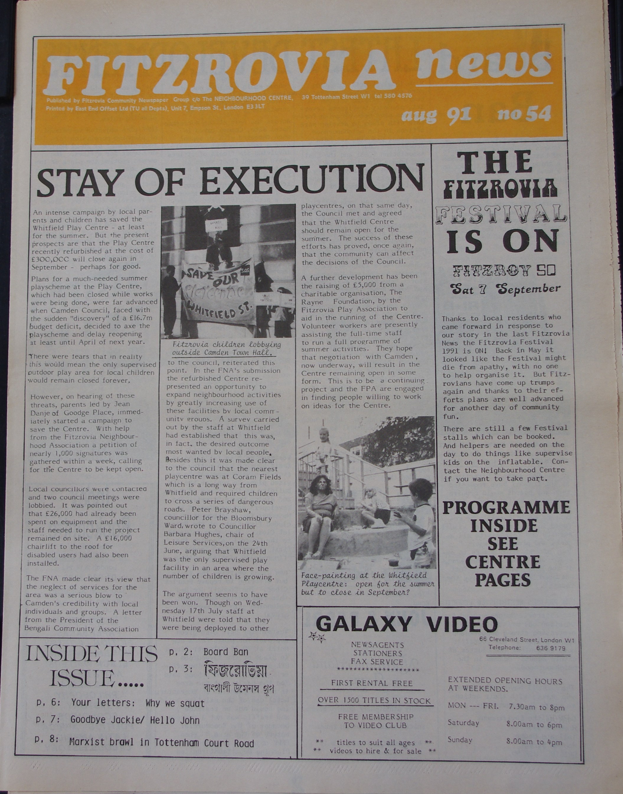 Front Page. Stay of execution. Fitzrovia Play Centre saved for time being. The Fitzrovia Festival is on!
