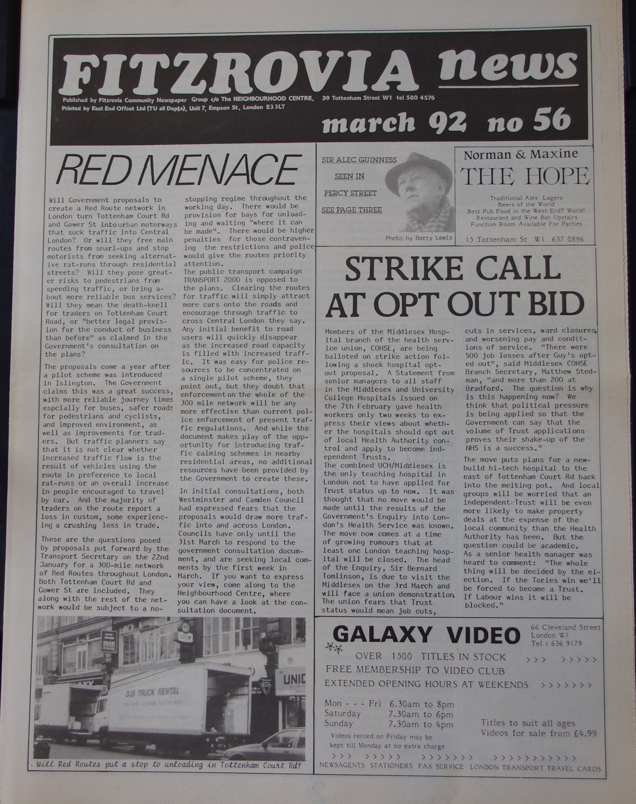 Front Page. Red menace. Red route plans could turn Tottenham Court Road and Gower Street into motorways. Strike call at opt out bid. Middlesex Hospital.